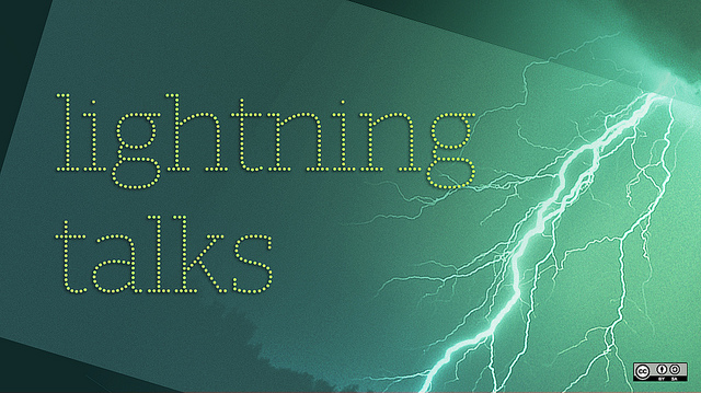 Lightning talks are 4-5 minute talks by you about your awesome project, weird issues, systems, concepts or some made-up technique.